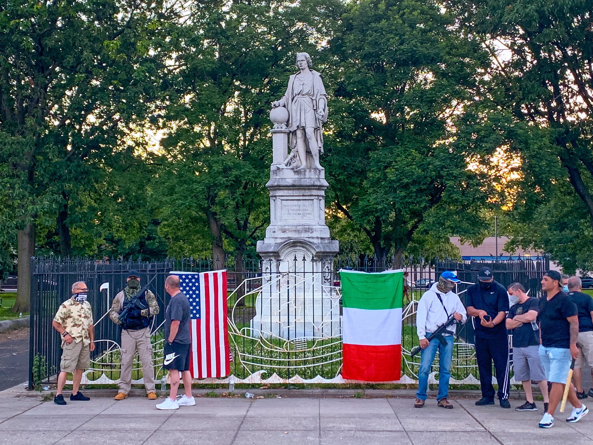 Racist vigilantes gathering with bats and guns at the statue of Christopher Columbus at Columbus Square in South Philadelphia, some of them just assaulted our reporter pic.twitter.com/kvUn9dLTaV